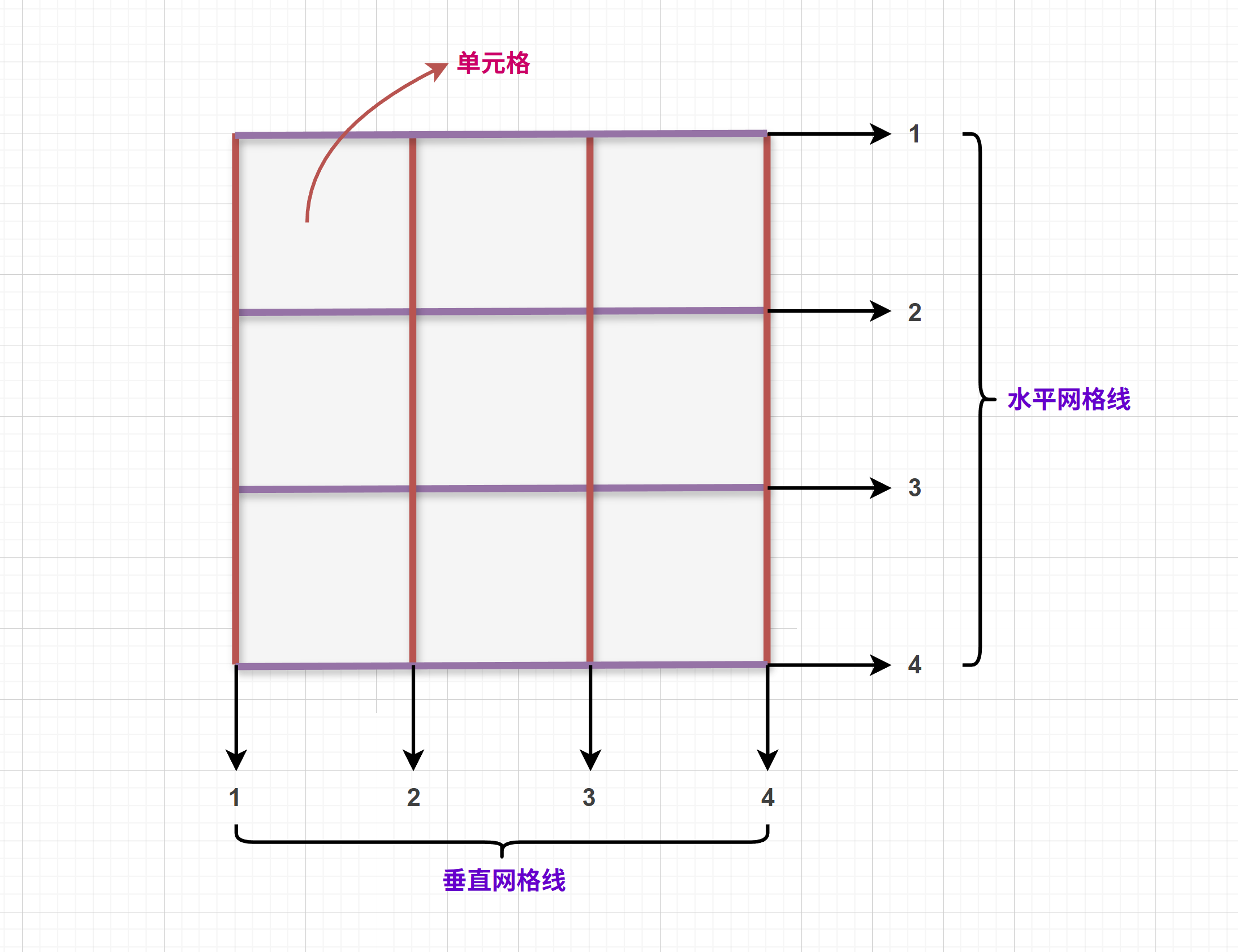 “网格线”(grid line)。水平网格线划分出行,垂直网格线划分出列。 - 正常情况下,
