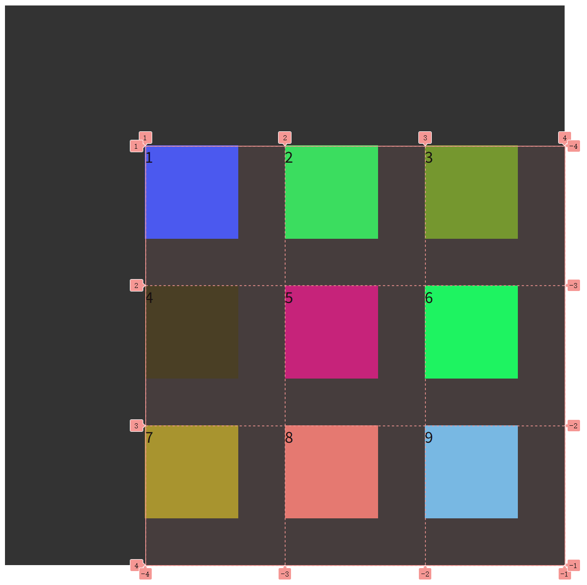 3 * 3,因此有4根垂直网格线和4根水平网格线。方括号里面依次是这八根线的名字。网格布局允许一根线有多个名字,比如[c1 bar]